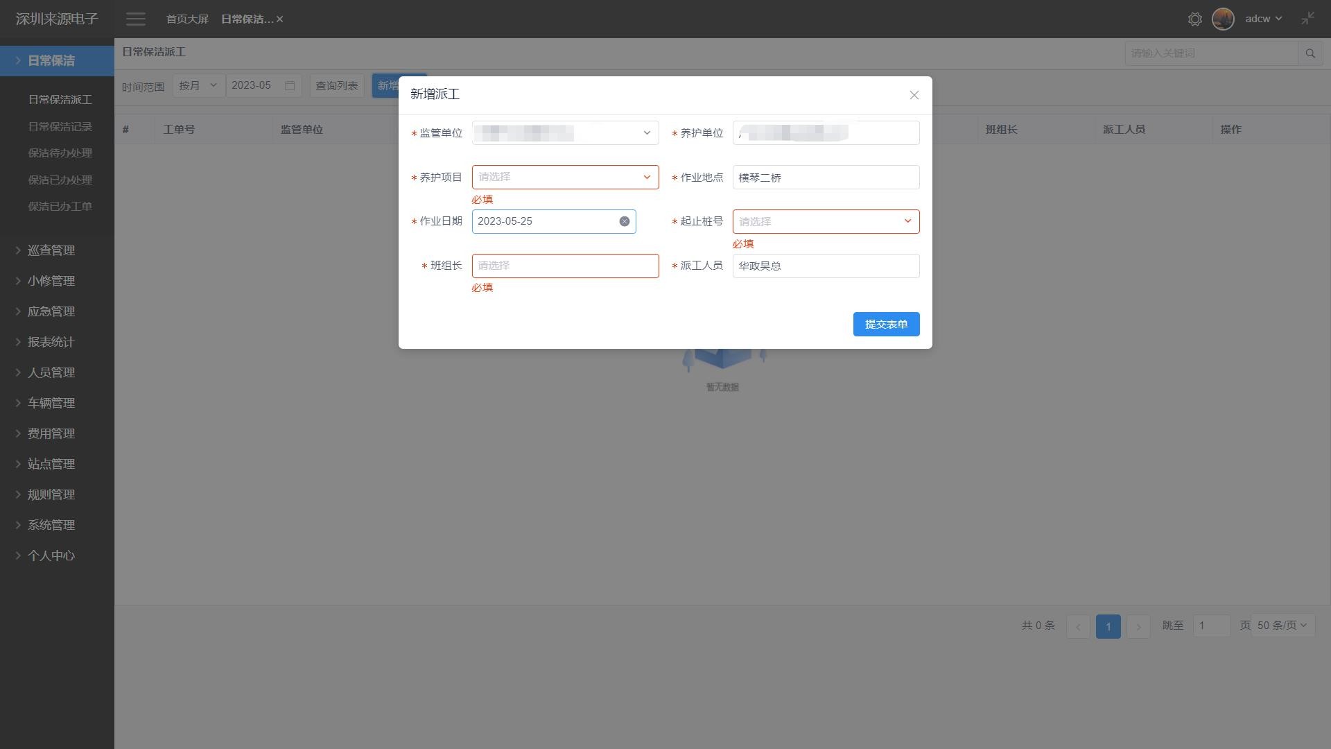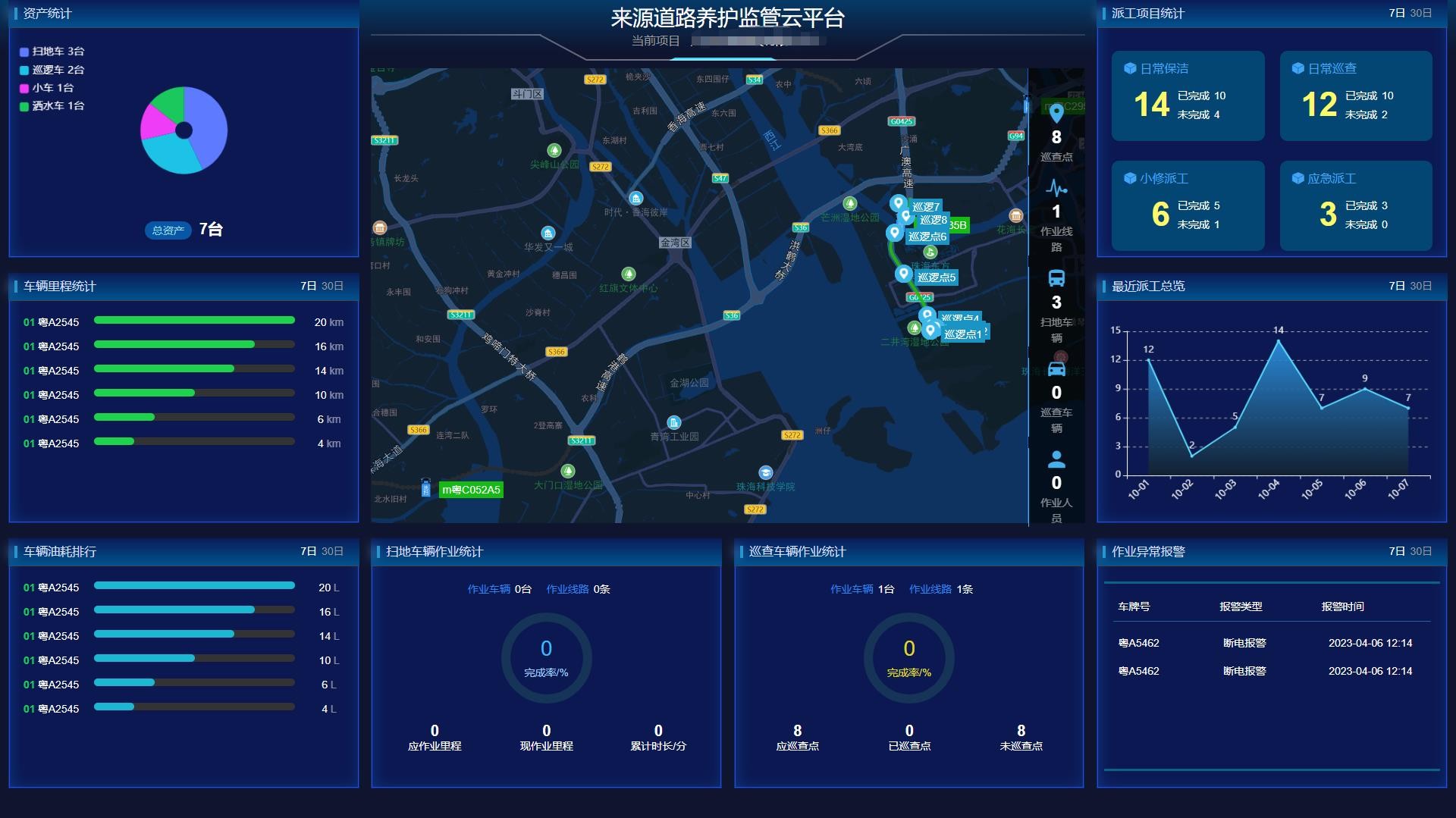 市政车辆大多数需要按照指定的时间,地点,路线,区域进行作业。结合日常派工,任务完成率也成为了考核标准之一。传统方式派工流程繁琐,进度缓慢,希望依靠智能化系统,实现车辆管理自动化,日常派工高效化,作业考勤人性化